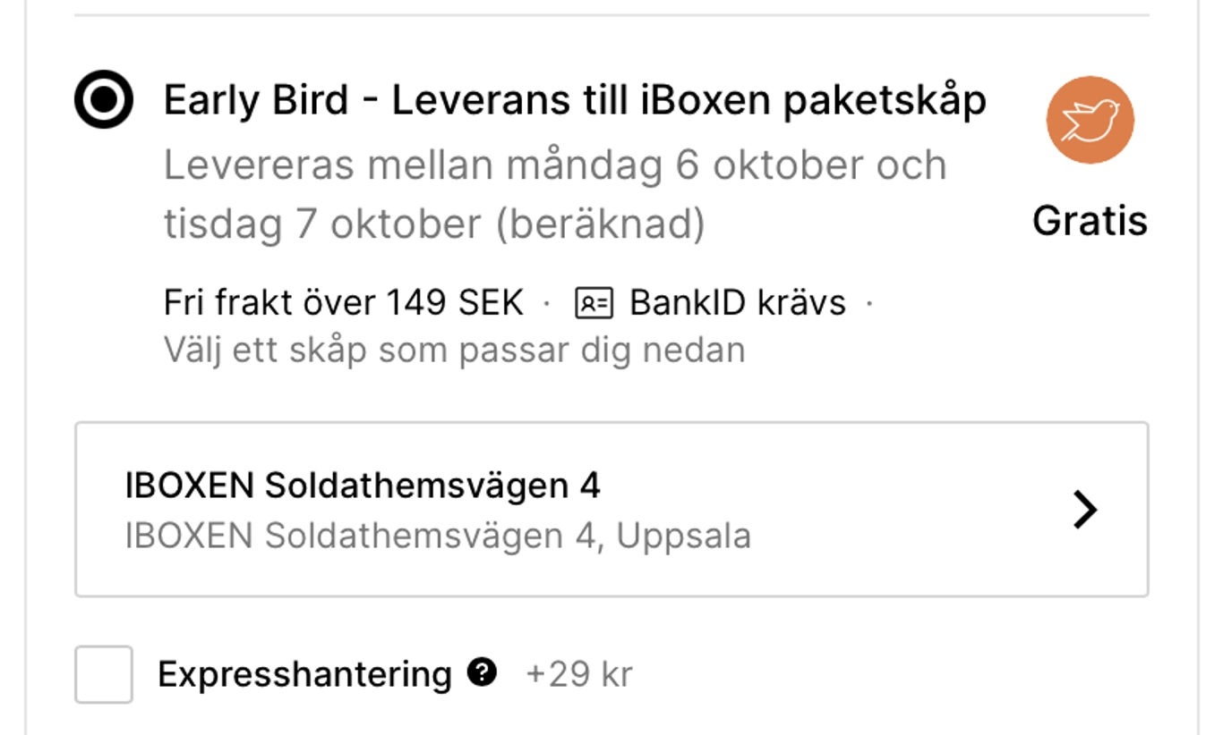 Early Bird Box. I checkouten kommer det tydligt framgå att det är; Early Bird Box / iBoxen.Vad har ni för fallback-lösning om en box skulle vara full?